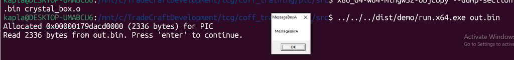 Zero relocations in .text. And the only relocations are in .pdata which is the exception handling metadata and is not part of the executable code. We can now get the .text section and execute it with a classic shellcode loader:
