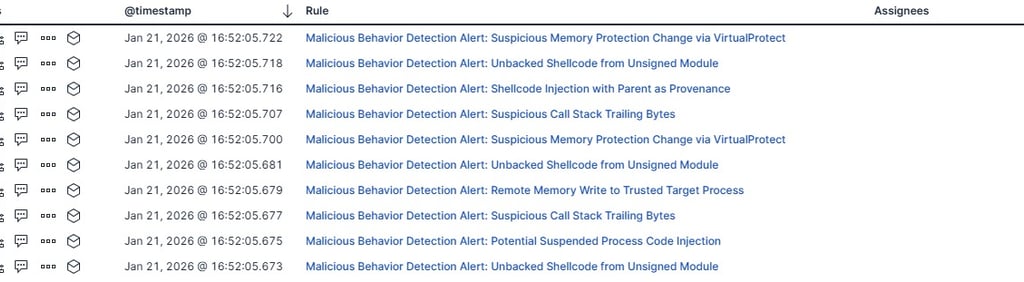 But what about the APIs called by the loader itself??? Yeah, those need to be spoofed too. Every call to CreateFileW, NtCreateSection, VirtualProtect and friends made during the loader setup phase has a call chain that traces back to our unbacked PICO. The Elastic behavioral rule does not care that beacon's call stack is clean, it will fire on specific API call with an unbacked frame anywhere in the chain.
