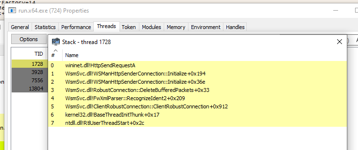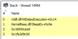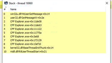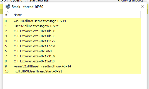 This is a downward growing chain starting from the highest address at the bottom (the oldest frame) and ending at the current instruction at the top. Because CFF Explorer is a legitimate binary, the OS can use .pdata to map every raw return address back to a named function, giving you clean “Module!Function+Offset” symbols all the way down. Contrast that with the call stack from our simple loader, where frames below a certain point were raw hex addresses with no module name. That happens because those return addresses point into memory that has no ".pdata" registered and no backing file on disk. The unwinder cannot resolve them.