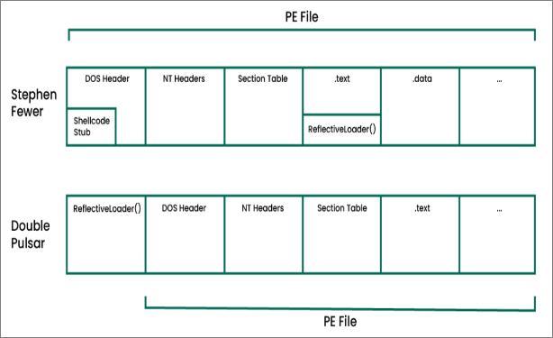 sRDI is the natural evolution of rDLL and it comes in multiple flavours. Fortra illustrated the two main differences in how these loaders can be applied: the first one, the original approach, places a small shellcode stub inside the DOS header responsible for finding the exported ReflectiveLoader function and calling it; the second one, the more modern approach, has the full reflective loading steps prepended to the DLL payload entirely. This second approach is the one we will be using today and it has a significant advantage over Stephen Fewer's original implementation. The DLL can now be any DLL, it does not need to have the reflective loading steps compiled into it, because all the loading logic is handled entirely by the prepended loader. This makes the technique modular: you can swap the loader independently of the payload.