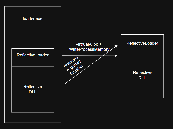 A Reflective DLL is a special kind of DLL that acts as a position independent payload. Regardless of where it ends up in memory, if you jump to the right place it will just work. To make this possible the DLL exports a special function, conventionally named ReflectiveLoader, which is responsible for performing all the steps that the Windows loader would normally handle: