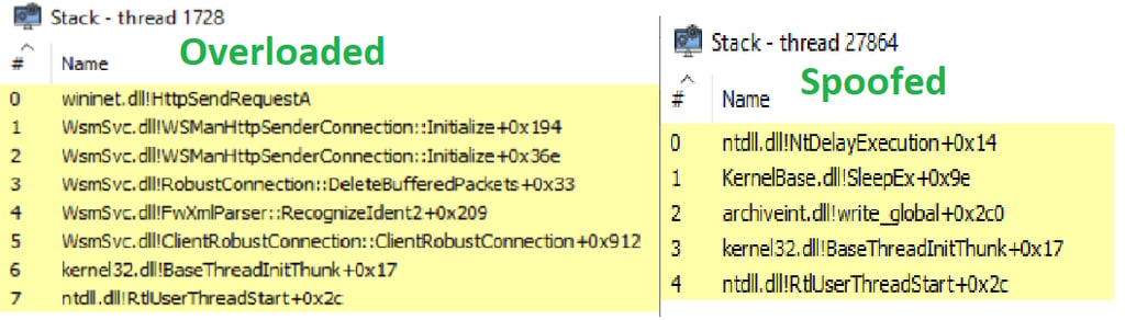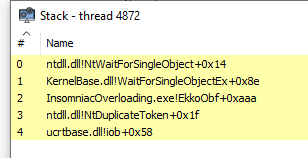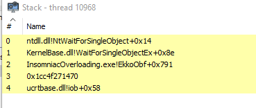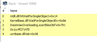 Notice how InsomniaOverloading.exe!EkkoObf resolves correctly, but everything below is garbage. The unwinder walks through the function, hits the context boundary, and has nothing left to unwind through. The thread pool worker was initialized differently, and there is no RUNTIME_FUNCTION chain leading back to a clean thread start.