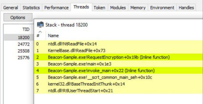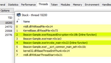 The beacon's thread is just blocked on a pipe read. It never leaves its original context. If we keep the unwind data readable, the call stack will resolve cleanly through the stomped module, down to BaseThreadInitThunk and RtlUserThreadStart.