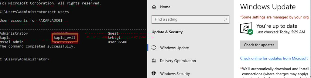 Then, using the Domain Administrator account, I triggered a check for updates on the AD Domain Controller and observed that the kapla_evil account was successfully created.