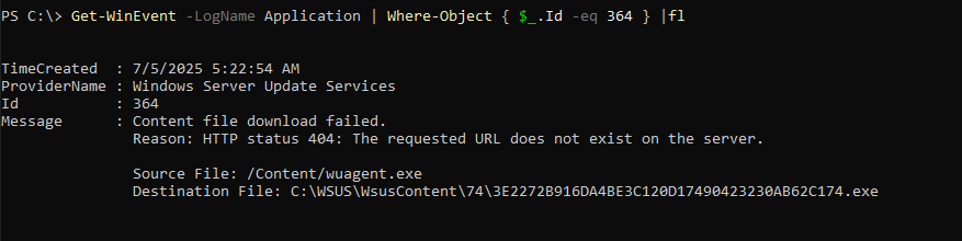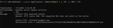 This PowerShell command retrieves Application log events with ID 364 (typically Windows Update errors) and gives the output back: