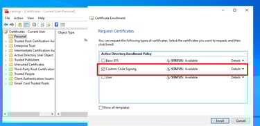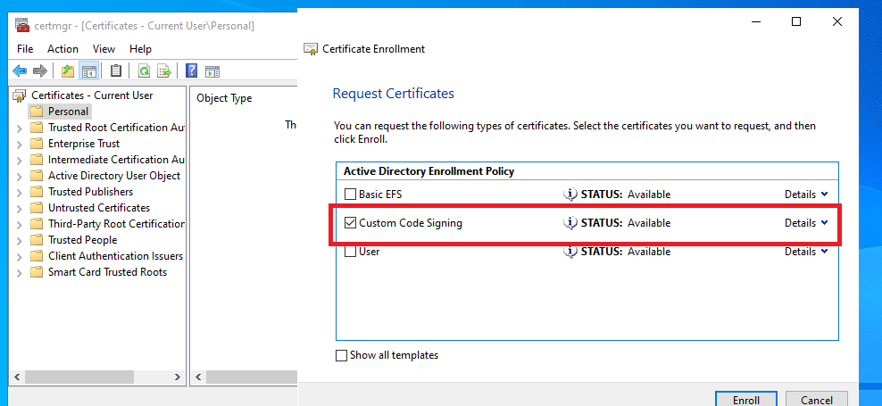 If you have enough privileges you can request a code signing certificate (In my environment the WSUS Administrator can)